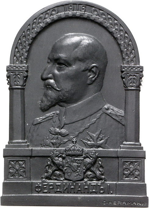Los-Nummer: Auktion 51 - 2924 Ausländische Münzen und Medaillen Bulgarien Ferdinand I. 1887-1918, Zinkplakette#0Medaille# 1916, von Herrmann. Auf die Befreiung Mazedoniens. Unter auf zwei Säulen ruhendem Bogen das Porträt Ferdinands nach links, unten auf Sockel halten zwei Löwen gekrönten Schild / Unter auf Säulen ruhendem Bogen gekrönter Schild, unten auf Sockel drei Zeilen Schrift. Wurzbach 2067. 70 x 50 mm. Prägefrisch Schätzpreis: 250,- Zuschlag: unverkauft |