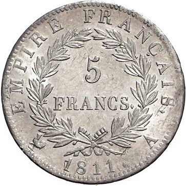 Los-Nummer: Auktion 51 - 3012 Ausländische Münzen und Medaillen Frankreich Napoleon I. 1804-1814, 1815, 5 Francs 1811 A, Paris. Gadoury 584, Davenport 85. Prägebedingte Randunebenheiten, vorzüglich + Schätzpreis: 250,- Zuschlag: 270,- |