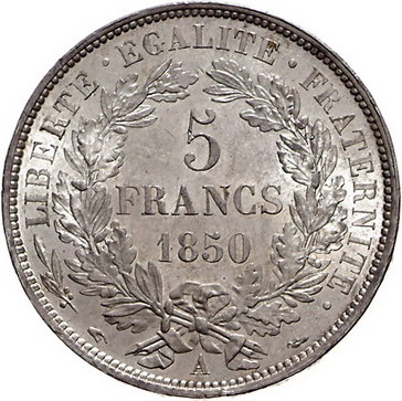 Los-Nummer: Auktion 51 - 3026 Ausländische Münzen und Medaillen Frankreich Zweite Republik 1848-1852, 5 Francs 1850 A. Gadoury 719. Winz. Randfehler, fast Stempelglanz Schätzpreis: 200,- Zuschlag: 205,- |