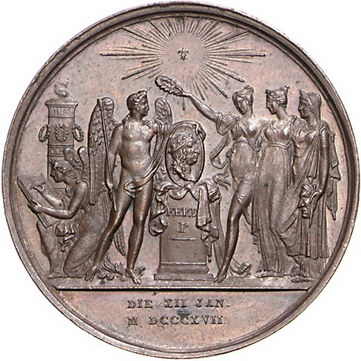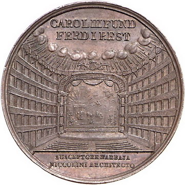 Los-Nummer: Auktion 51 - 3218 Ausländische Münzen und Medaillen Italien-Neapel, Stadt Bronzemedaille 1817. Auf den Wiederaufbau des 'Teatro di San Carlo'. Innenansicht / Medaillonbüste des Königs Ferdinand I. auf Sockel umgeben von allegorischen Figuren. 37 mm. Vorzüglich Schätzpreis: 125,- Zuschlag: 160,- |