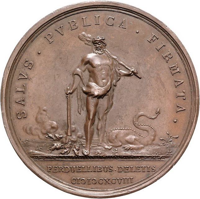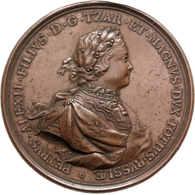 Los-Nummer: Auktion 51 - 3686 Ausländische Münzen und Medaillen Russland Peter der Große 1689-1725, Bronzemedaille 1698, von Judin. Auf die 'Vertilgung' der Strelitzen (die Ermordung seiner Leibwachen). Brustbild nach rechts / Herkules zerquetscht vierköpfigen Drachen. Diakov 9.1, Smirnov - vergl. 161, Iversen 11/1. 66 mm. Sehr schön - vorzüglich Schätzpreis: 400,- Zuschlag: 320,- |