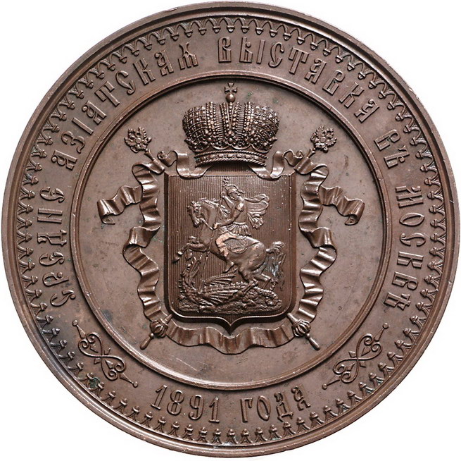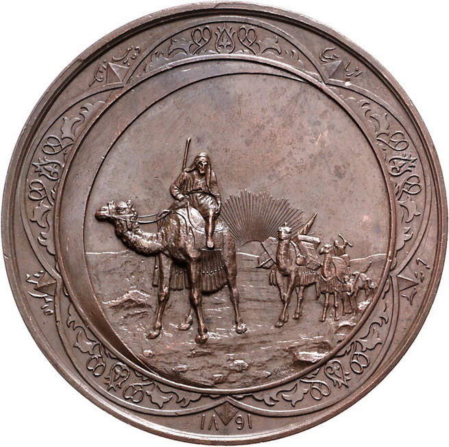 Los-Nummer: Auktion 51 - 3851 Ausländische Münzen und Medaillen Russland Alexander III. 1881-1894, Bronzemedaille 1891, von Griliches. Auf die zentralasiatische Ausstellung in Moskau. Karawane in der Wüste / Stadtwappen von Moskau. Diakov 1061.1, Smirnov 997. 67 mm. Vorzüglich Schätzpreis: 350,- Zuschlag: unverkauft |