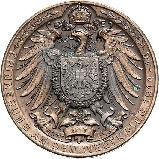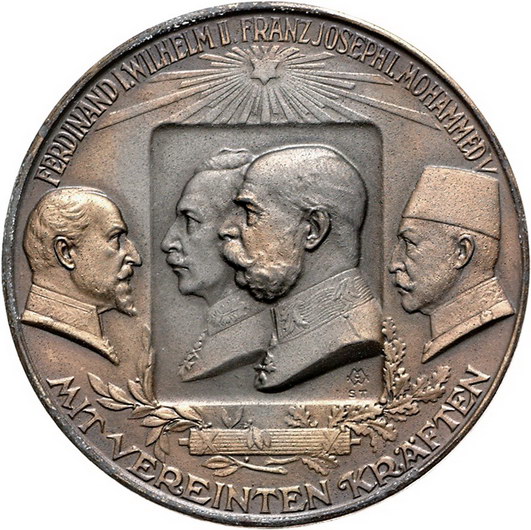 Los-Nummer: Auktion 51 - 2521 Medaillen Erster Weltkrieg Verzinkte Bronzemedaille 1916. Auf die Waffenbrüderschaft mit Österreich, der Türkei und Bulgarien. Die Brustbilder Wilhelms II. und Franz Josephs in vertieftem Rechteck nach links, links das Brustbild Ferdinands I., rechts das von Mohammed V. / Gekrönter Reichsadler mit Adlerschild. Zetzmann vergl. 3049 (Vs.) , Slg. Dogan 6689 (Vs.). 54,5 mm. Zinkauflage abgegriffen, fast vorzüglich Schätzpreis: 175,- Zuschlag: 550,- |