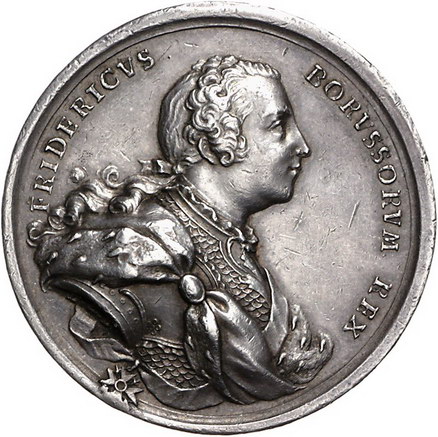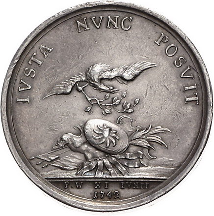 Los-Nummer: Auktion 51 - 465 Altdeutsche Münzen und Medaillen Brandenburg-Preußen Medaillen Friedrichs II. Medaille 1742, von Barbiez. Auf den Frieden zu Breslau. Brustbild nach rechts / Schwebender Adler mit Ölzweig über Trophäen. Olding 532, Fr.u.S. 4262. 44,6 mm, 59,17 g. Äußerst selten. Sehr schön Schätzpreis: 2500,- Zuschlag: 2500,- |