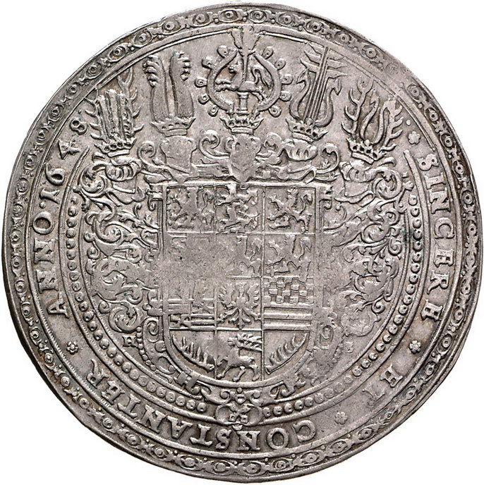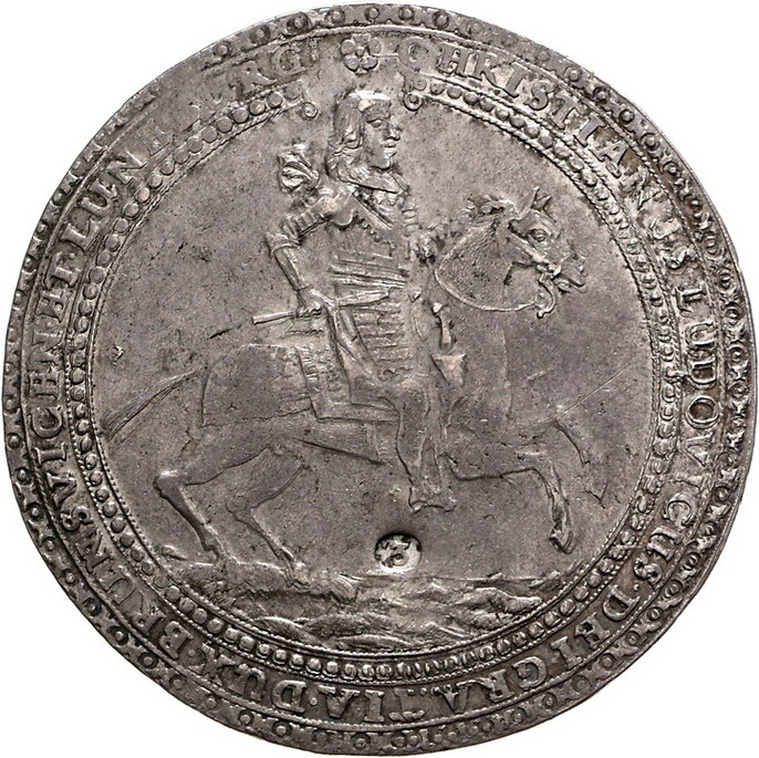 Los-Nummer: Auktion 51 - 661 Altdeutsche Münzen und Medaillen Braunschweig-Lüneburg-Celle Christian Ludwig 1648-1665, Löser zu 3 Talern 1648, Zellerfeld. Reitender Herzog nach rechts / Wappen. Mit Wertpunze. Welter 1474, Davenport 146 a , Slg. Milas 70. Sehr schön - vorzüglich Schätzpreis: 3000,- Zuschlag: unverkauft |