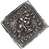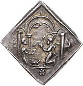 Los-Nummer: Auktion 51 - 779 Altdeutsche Münzen und Medaillen Erzgebirge Klippenförmige Medaille 1551. Kopf des Elias mit phrygischer Mütze nach links / Darstellung der Geburt Christi. Katz 362. 13 x 13 mm, 1,75 g. Geprägtes Original. Schöne Patina. Vorzüglich Schätzpreis: 500,- Zuschlag: unverkauft |