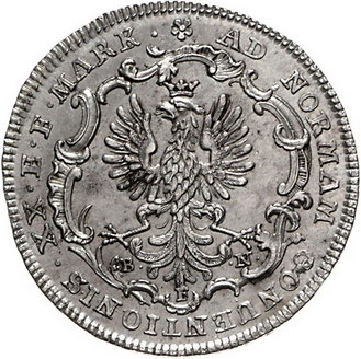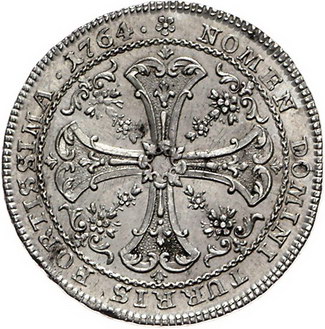 Los-Nummer: Auktion 51 - 792 Altdeutsche Münzen und Medaillen Frankfurt, Stadt 1/2 Taler 1764. Adler in Rokokoverzierung / Kreuz. J.u.F. 832 a. Vorzüglich Schätzpreis: 1000,- Zuschlag: 900,- |