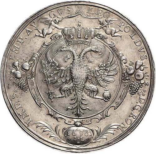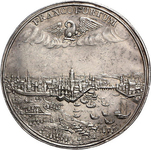 Los-Nummer: Auktion 51 - 795 Altdeutsche Münzen und Medaillen Frankfurt, Stadt Schautalerförmige Medaille 1696, von Johannes Link aus Heidelberg. Ansicht der Stadt mit Sachsenhausen von Westen, darüber Adler mit Donnerkeil in Wolken / In einer mit Früchten verzierten Kartusche der kaiserliche Doppeladler mit den Reichsinsignien, oben halten zwei Putti die Krone. J.u.F. 594. 52 mm, 38,10 g. Sehr selten. Vorzüglich Schätzpreis: 6000,- Zuschlag: 5000,- |