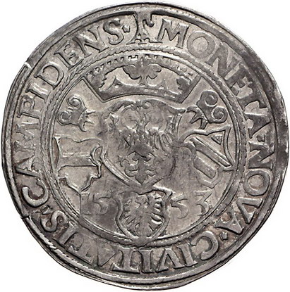 Los-Nummer: Auktion 51 - 960 Altdeutsche Münzen und Medaillen Kempten, Stadt Taler 1553. Nau 165, Bernhart 172 var, Davenport 9366, Haertle 267, Schulten 1579. Prägeschwäche, sehr schön Schätzpreis: 750,- Zuschlag: unverkauft |