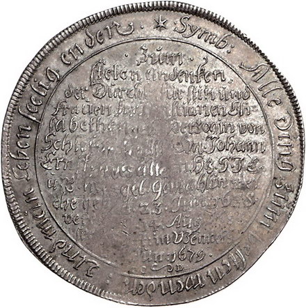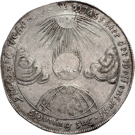 Los-Nummer: Auktion 51 - 1707 Altdeutsche Münzen und Medaillen Sachsen-Alt-Weimar Johann Ernst 1662-1683, Taler 1679. Auf den Tod seiner Gemahlin Christiane Elisabeth. Unter strahlendem Namen Jehovas der ihm zugekehrte Mond zwischen Wolken über Globus /Schrift. Slg. Merseburger 3931, Schnee 383, Davenport 7554, Koppe 421, Lange 562 , Tentzel 48/3, Slg. Koch 2040. Von größter Seltenheit. Prägeschwäche auf der Rückseite, sehr schön - vorzüglich Schätzpreis: 5000,- Zuschlag: unverkauft |