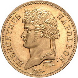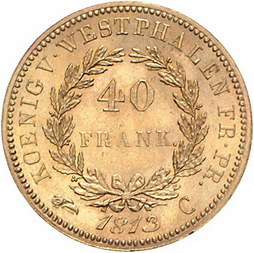 Los-Nummer: Auktion 51 - 1871 Altdeutsche Münzen und Medaillen Westfalen, Königreich Hieronymus Napoleon 1807-1813, 40 Franken 1813 C. Jaeger 44, AKS 27, Divo/Schramm 217, Friedberg 3515. Glatter Rand. GOLD. Vorzüglich - Stempelglanz Schätzpreis: 5000,- Zuschlag: 5600,- |