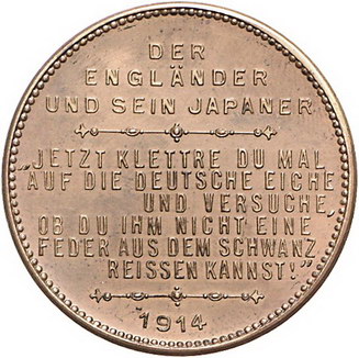 Los-Nummer: Auktion 51 - 2495 Medaillen Kolonien Satirische Bronzemedaille 1914. Wie vorher. Slg. Grönegreß 1363. 33,4 mm. Mattiert. Vorzüglich - prägefrisch Schätzpreis: 200,- Zuschlag: unverkauft |