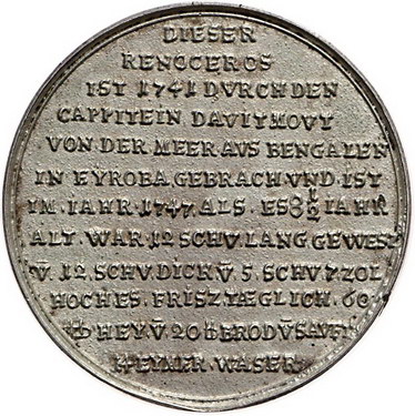 Los-Nummer: Auktion 51 - 1284 Altdeutsche Münzen und Medaillen Nürnberg, Stadt Medaillen, Silbergussmedaille 1748, von P.P. Werner. Auf das gezeigte Nashorn. Nashorn in Palmlandschaft unter strahlender Sonne / Vierzehn Zeilen französischer Text über Maß und Futtermengen des Nashorns. Slg. Erlanger 1138 , Imhoff II 189.60. 38,5 mm, 15,41 g. Älterer Guss. Sehr schön - vorzüglich Schätzpreis: 200,- Zuschlag: 540,- |