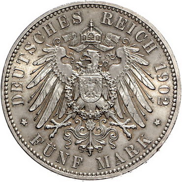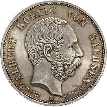 Los-Nummer: Auktion 51 - 2677 Münzen des Deutschen Kaiserreichs Sachsen Albert 1873-1902, 5 Mark 1902 E. Auf seinen Tod. Jaeger 128. Vorzüglich - Stempelglanz Schätzpreis: 125,- Zuschlag: unverkauft |