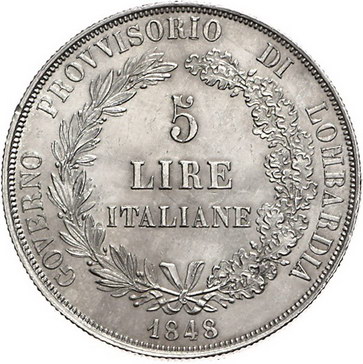 Los-Nummer: Auktion 51 - 2212 Haus Habsburg Haus Habsburg Italienische Revolution 1848, 5 Lire 1848, Mailand. Herinek 3, Jaeger/Jaeckel 277. Vorzüglich + Schätzpreis: 150,- Zuschlag: 180,- |