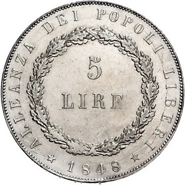 Los-Nummer: Auktion 51 - 2213 Haus Habsburg Haus Habsburg Italienische Revolution 1848, 5 Lire 1848. Aufstand in Venedig. Herinek 9, Davenport 208, KM 85. Vorzüglich - Stempelglanz Schätzpreis: 400,- Zuschlag: 360,- |