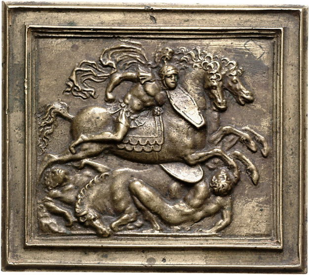 Los-Nummer: Auktion 51 - 2469 Medaillen Renaissance Deutschland Einseitige Bronzeplakette (16./17. Jahrhundert) , Italien? Darstellung eines Reiterkampfes, Reiter über am Boden liegenden Feinden und Pferden. Weber -. 64,5 x 57 mm. Vorzüglich Schätzpreis: 500,- Zuschlag: unverkauft |