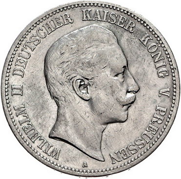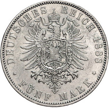Los-Nummer: Auktion 51 - 2653 Münzen des Deutschen Kaiserreichs Preußen Wilhelm II. 1888-1918, 5 Mark 1888 A. Jaeger 101. Fast sehr schön Schätzpreis: 300,- Zuschlag: 310,- |