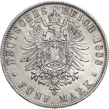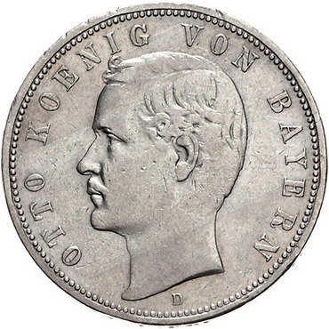 Los-Nummer: Auktion 51 - 2592 Münzen des Deutschen Kaiserreichs Bayern Otto 1886-1913, 5 Mark 1888 D. Jaeger 44. Winz. Randfehler, sehr schön + Schätzpreis: 250,- Zuschlag: 220,- |