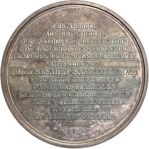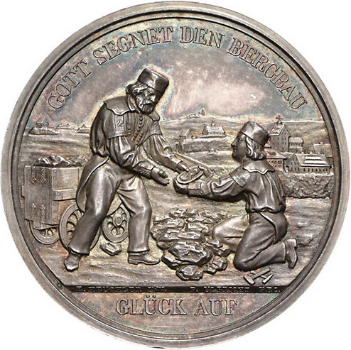 Los-Nummer: Auktion 51 - 1591 Altdeutsche Münzen und Medaillen Sachsen-Albertinische Linie Friedrich August II. 1836-1854, Ausbeutemedaille 1847, von Heuchler und Ulbricht. Auf das Ausbringen der Grube Himmelfahrt samt Abraham. Vor den Tagesanlagen der Grube Himmelfahrt reicht ein kniender, jüngerer Bergmann einem älteren, der neben einem Förderwagen steht, eine Mulde mit Erz / Schrift. Slg. Merseburger - , Slg. Vogelsang 1093, Müseler 56.2.2/11. 51 mm, 65,58 g. Prachtexemplar von schönster Erhaltung. Herrliche Patina. Stempelglanz Schätzpreis: 4000,- Zuschlag: 3700,- |