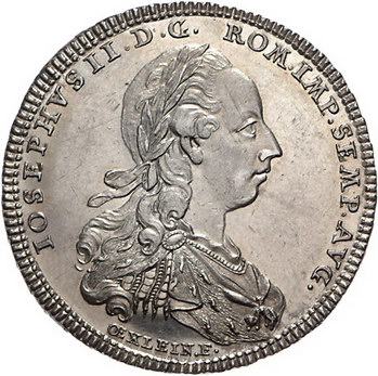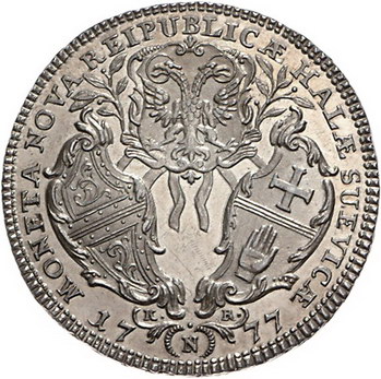 Los-Nummer: Auktion 51 - 864 Altdeutsche Münzen und Medaillen Hall in Schwaben 1/2 Taler 1777. Stempel von Oexlein, Signatur OE. Mit Namen Josephs II. Raff 53.1. Prachtexemplar von polierten Stempeln. Fast Stempelglanz Schätzpreis: 750,- Zuschlag: 675,- |