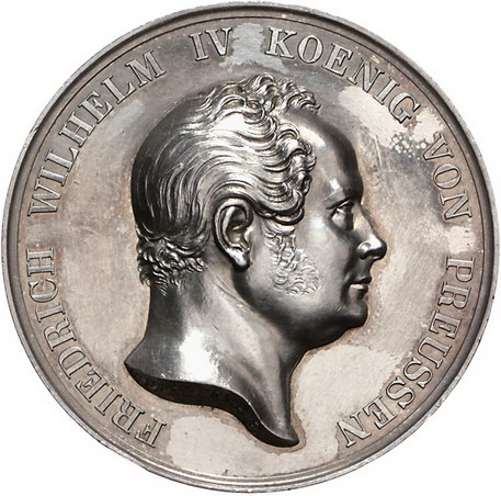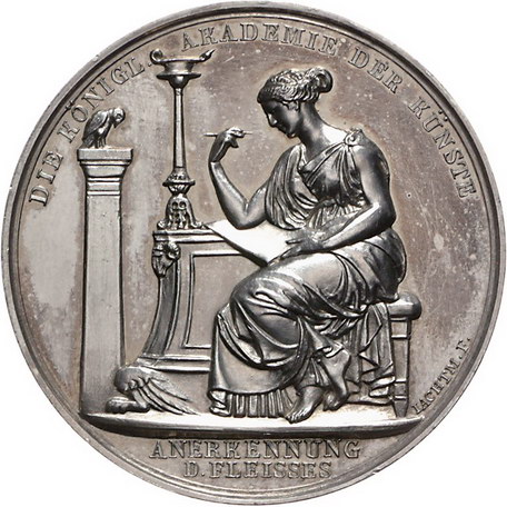 Los-Nummer: Auktion 51 - 563 Altdeutsche Münzen und Medaillen Brandenburg-Preußen Friedrich Wilhelm IV. 1840-1861, Medaille o.J., von Pfeuffer und Jachtmann. Preismedaille der Akademie der Künste. Büste nach rechts / Sitzende Frau mit Griffel und Pergament lehnt an Postament mit antiker Lampe, neben ihr auf Säulenstumpf eine Eule. Slg. Henckel 2466, Slg. Marienburg 4175 , Sommer P 108. 47 mm, 51,09 g. Minimal berieben, vorzüglich + Schätzpreis: 200,- Zuschlag: 200,- |