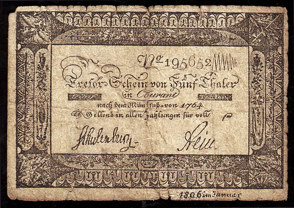 Los-Nummer: Auktion 51 - 592 Altdeutsche Münzen und Medaillen Brandenburg-Preußen Papiergeld, Tresorschein zu 5 Thaler courant nach dem Münzfuß von 1764. Unten Vermerk '1806 im Januar'. Pick/Rixen A 203, Keller 86 b. Stark gebraucht Schätzpreis: 100,- Zuschlag: 160,- |