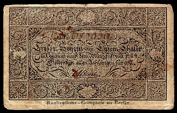 Los-Nummer: Auktion 51 - 594 Altdeutsche Münzen und Medaillen Brandenburg-Preußen Papiergeld, Tresorschein zu 1 Thaler courant nach dem Münzfuß von 1764. Unten: Realisations-Comptoir zu Berlin. Pick/Rixen A 207 a, Keller 86 c.I. Gebraucht Schätzpreis: 100,- Zuschlag: 170,- |