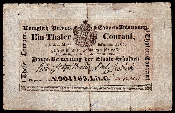 Los-Nummer: Auktion 51 - 597 Altdeutsche Münzen und Medaillen Brandenburg-Preußen Papiergeld, Hauptverwaltung der Staatsschulden. Ein Thaler Courant vom 6. Mai 1824. Pick/Rixen A 208, Keller 87 a. Gebraucht und an Faltstelle leicht eingerissen Schätzpreis: 100,- Zuschlag: 130,- |