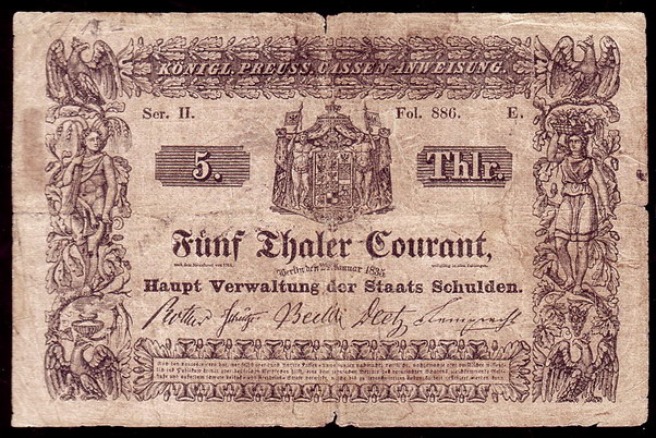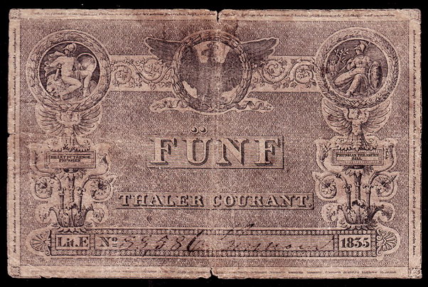 Los-Nummer: Auktion 51 - 600 Altdeutsche Münzen und Medaillen Brandenburg-Preußen Papiergeld, Fünf Thaler Courant vom 2. Januar 1835. Pick/Rixen A 212, Keller 87 b. Gebraucht und an Faltstelle leicht eingerissen Schätzpreis: 150,- Zuschlag: 210,- |