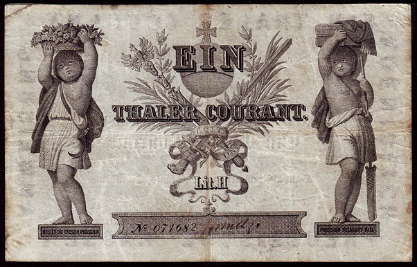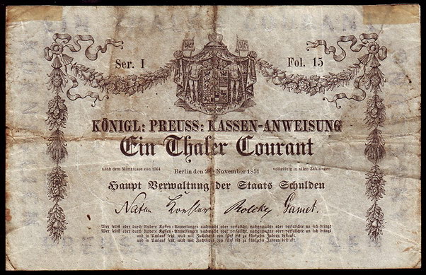 Los-Nummer: Auktion 51 - 601 Altdeutsche Münzen und Medaillen Brandenburg-Preußen Papiergeld, Ein Thaler Courant vom 2. November 1851. Pick/Rixen A 215, Keller 87 c. Gebraucht und an Faltstelle leicht eingerissen Schätzpreis: 100,- Zuschlag: 140,- |