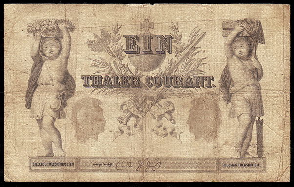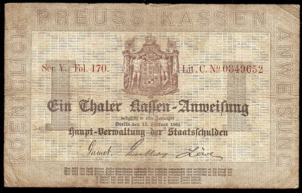 Los-Nummer: Auktion 51 - 604 Altdeutsche Münzen und Medaillen Brandenburg-Preußen Papiergeld, Ein Thaler vom 13. Februar 1861. Pick/Rixen A 222, Keller 87 e. Gebraucht Schätzpreis: 50,- Zuschlag: 130,- |