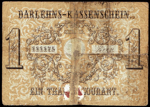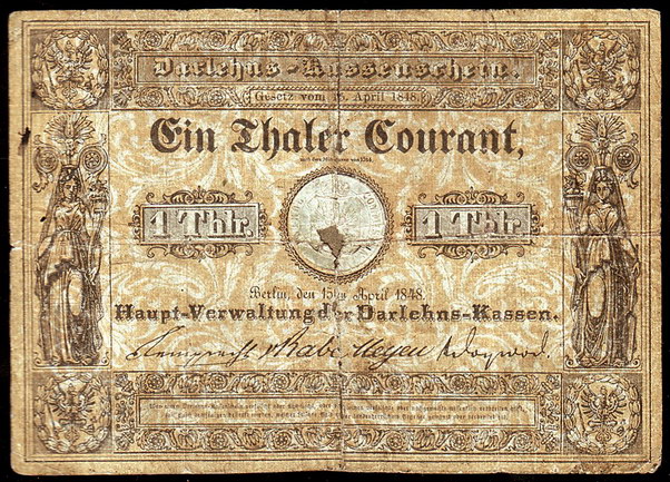 Los-Nummer: Auktion 51 - 605 Altdeutsche Münzen und Medaillen Brandenburg-Preußen Papiergeld, Darlehns-Kassenschein. Ein Thaler Courant vom 15. April 1848. Pick/Rixen A 223, Keller 88 a. Stark gebraucht, repariert, in der Mitte kleines Loch Schätzpreis: 100,- Zuschlag: 100,- |