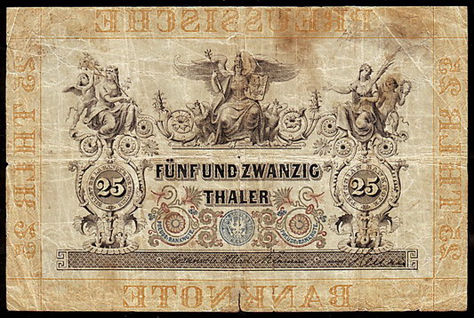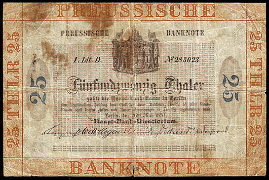 Los-Nummer: Auktion 51 - 606 Altdeutsche Münzen und Medaillen Brandenburg-Preußen Papiergeld, Preußische Haupt-Bank. 25 Thaler vom 26. Mai 1857. Pick/Rixen A 249, Keller 89 d. Stärker gebraucht Schätzpreis: 1250,- Zuschlag: 1900,- |