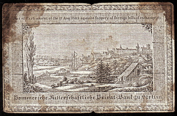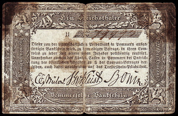 Los-Nummer: Auktion 51 - 609 Altdeutsche Münzen und Medaillen Brandenburg-Preußen Papiergeld, Stettin. Pommersche Ritterschaftliche Privatbank. Ein Reichsthaler o.D. (1824/1825). Pick/Rixen A 335, Keller 113 a. Fleckig, stark gebraucht Schätzpreis: 75,- Zuschlag: 130,- |