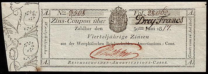 Los-Nummer: Auktion 51 - 1872 Altdeutsche Münzen und Medaillen Westfalen, Königreich Hieronymus Napoleon 1807-1813, Zinscoupon der Reichsschulden-Amortisations-Casse vom 14. Juli 1808 zahlbar am 30. September 18. Nicht ausgefüllt und entwertet. Ebenso über 3 Francs und 6 Francs vom 14. Juli 1808, zahlbar am 30. Juni 1817. 3 Stück. Fast druckfrisch Schätzpreis: 50,- Zuschlag: 50,- |