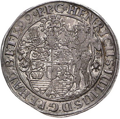 Los-Nummer: Auktion 51 - 623 Altdeutsche Münzen und Medaillen Braunschweig-Wolfenbüttel Heinrich Julius 1589-1613, Pelikantaler 1599, Goslar. Münzmeister Heinrich Depsern. Pelikan füttert Junge / Wilder Mann neben Wappen. Abgekürzte Jahreszahl. Welter 631, Davenport 9094. #09095} Schöne Patina. Fast vorzüglich Schätzpreis: 1250,- Zuschlag: unverkauft |