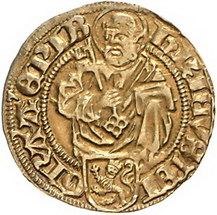 Los-Nummer: Auktion 51 - 680 Altdeutsche Münzen und Medaillen Bremen, Erzbistum Heinrich II. von Schwarzburg 1463-1496, Goldgulden, Bremen. St. Petrus in halber Figur von vorn mit Schlüssel und Buch, unten das Schwarzburger Wappen / Vierfeldiges Wappen auf Langkreuz. Umschrift endet EP'IB. Jungk 38 var, Bethe - vergl. 1533 ff, Friedberg 427. GOLD. Sehr schön - vorzüglich Schätzpreis: 1250,- Zuschlag: 1000,- |