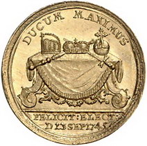Los-Nummer: Auktion 51 - 790 Altdeutsche Münzen und Medaillen Frankfurt, Stadt Dukat 1745, von Oexlein. Auf die Krönung Franz' I. Brustbild nach rechts / Tisch mit Krönungsinsignien. J.u.F. 776, Friedberg 1006, Förschner 298. GOLD. Vorzüglich - Stempelglanz Schätzpreis: 1250,- Zuschlag: unverkauft |