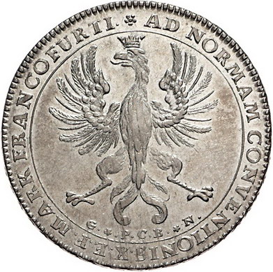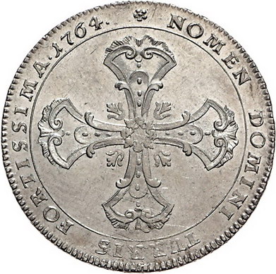 Los-Nummer: Auktion 51 - 791 Altdeutsche Münzen und Medaillen Frankfurt, Stadt Taler 1764. Nach links blickender Frankfurter Adler / Reich verziertes Kreuz. J.u.F. 831 e, Davenport 2223. Minimal justiert, vorzüglich - Stempelglanz Schätzpreis: 750,- Zuschlag: 600,- |