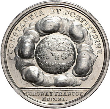 Los-Nummer: Auktion 51 - 797 Altdeutsche Münzen und Medaillen Frankfurt, Stadt Medaille 1711, unsigniert, von Georg Wilhelm Vestner. Auf die Krönung Karls VI. Brustbild halbrechts / Erdkugel von Wolken umgeben. J.u.F. 670 , Förschner 196, Bernheimer 11. 38 mm, 21,79 g. Kratzer, vorzüglich + Schätzpreis: 300,- Zuschlag: unverkauft |