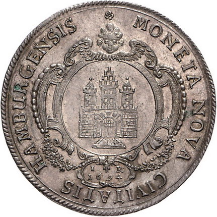 Los-Nummer: Auktion 51 - 871 Altdeutsche Münzen und Medaillen Hamburg-Stadt Taler 1694 IR. Unter Engelskopf Stadtwappen in Kartusche, darunter die Münzmeisterinitialen / Gekrönter Doppeladler mit Zepter und Schwert in den Klauen und Reichsapfel auf der Brust. Gaedechens 523, Davenport 5374. Vorzüglich Schätzpreis: 600,- Zuschlag: 480,- |