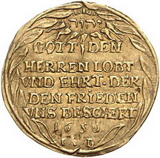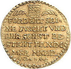 Los-Nummer: Auktion 51 - 1646 Altdeutsche Münzen und Medaillen Sachsen-Neu-Gotha Ernst der Fromme 1640-1675, Dukat 1650, Gotha. Auf den Westfälischen Frieden. Strahlender Name Gottes über fünf Zeilen Schrift und Jahr / Rautenwappen über sechs Zeilen Schrift. Steguweit 3, Friedberg 2948 , Dethlefs-Ordelheide 66. GOLD. Sehr schön Schätzpreis: 1250,- Zuschlag: 1100,- |