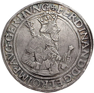 Los-Nummer: Auktion 51 - 1979 Haus Habsburg Haus Habsburg Ferdinand I. 1521-1564, Schwerer Reichsguldiner zu 72 Kreuzern o.J., Hall. Schulten 4519, Davenport 8029, Voglhuber 48/2, Moser/Tursky 124. #0Dav. 8027} Sehr schön Schätzpreis: 500,- Zuschlag: unverkauft |