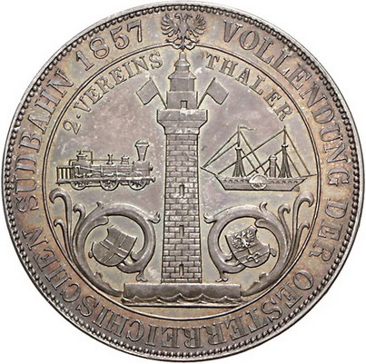 Los-Nummer: Auktion 51 - 2221 Haus Habsburg Haus Habsburg Franz Joseph I. 1848-1916, Doppeltaler 1857 A. Vollendung der Südbahn. Spitze des Lorbeerkranzes zeigt auf A in der Umschrift. Herinek 821 Anm, Jaeger/Jaeckel 320, Thun 444, Kahnt 356. Prachtexemplar. Herrliche Patina. Winz. Kratzer, Polierte Platte Schätzpreis: 4000,- Zuschlag: 3800,- |
