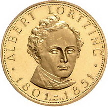 Los-Nummer: Auktion 51 - 2416 Medaillen Musiker Lortzing, Albert Gustav *1801 Berlin, +1851 Berlin, Goldmedaille o.J. (1957), von Hartig. Kopf von vorn / Lyra zwischen Lorbeerzweigen. Niggl 1204 b. 22,5 mm, 8,0 g (900er). GOLD. Fast Stempelglanz Schätzpreis: 225,- Zuschlag: 180,- |