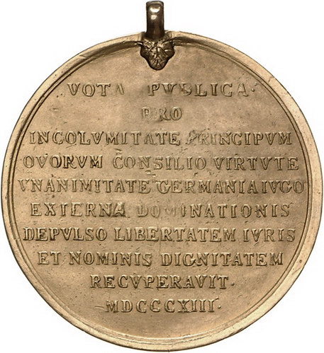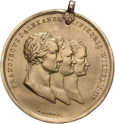 Los-Nummer: Auktion 51 - 3770 Ausländische Münzen und Medaillen Russland Alexander I. 1801-1825, Goldmedaille 1813, von Lang. Auf das Bündnis zwischen Preußen, Österreich und Russland. Die Köpfe der drei Monarchen nach rechts / Zehn Zeilen Schrift. Diakov 365.1 (R3) , Slg. Marienburg 3717 (Ag), Bolzenthal 62, Slg. Montenuovo 2385. 46,5 mm, 34,54 g. GOLD. Zeitgenössische Tragöse. Sehr schön Schätzpreis: 2000,- Zuschlag: unverkauft |