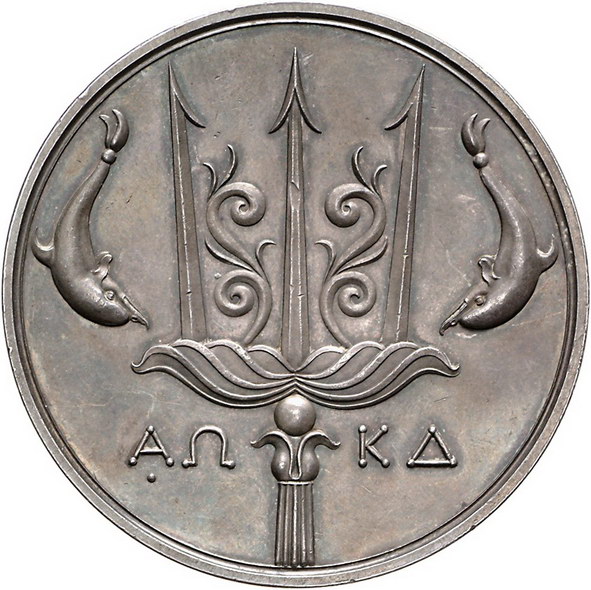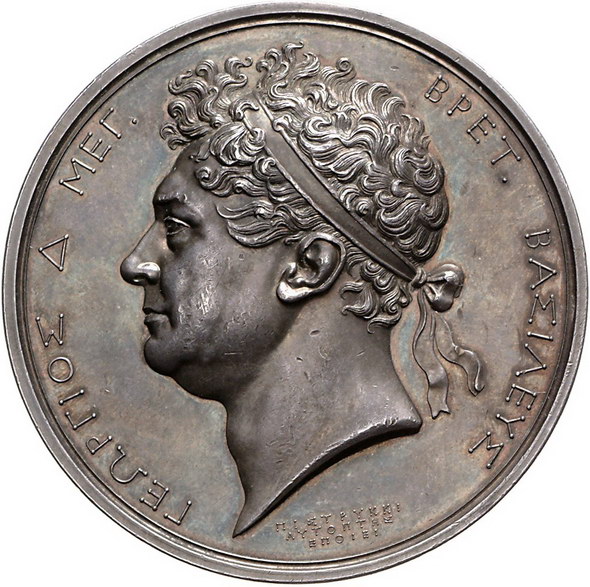 Los-Nummer: Auktion 51 - 3113 Ausländische Münzen und Medaillen Großbritannien George IV. 1820-1830, Medaille o.J. (1824), von Pistrucci. Wahrscheinlich auf die englische Unterstützung des griechischen Freiheitskampfes. Antikisierte und belorbeerte Büste Georgs IV. nach links / Dreizack zwischen zwei Delphinen und { AW-KD}. Eimer 1171, Brown 1221. 60 mm, 125 g. Schöne Patina. Vorzüglich Schätzpreis: 1000,- Zuschlag: 1200,- |