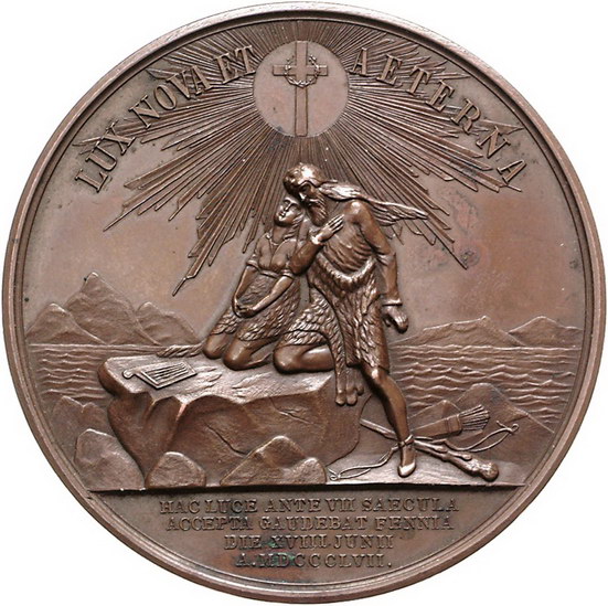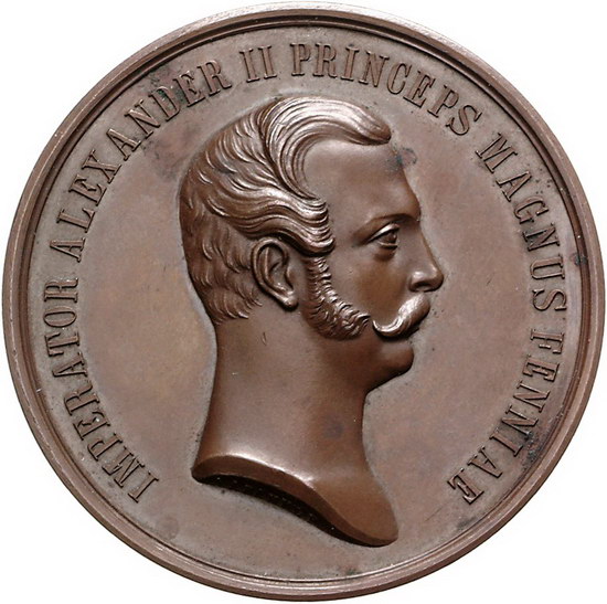 Los-Nummer: Auktion 51 - 3830 Ausländische Münzen und Medaillen Russland Alexander II. 1855-1881, Bronzemedaille 1857, von Ljälin. Auf die 700-Jahrfeier der Einführung des Christentums in Finnland. Kopf nach rechts / Mann und Frau auf Felsen im Meer kniend, darüber Kreuz im Strahlenkranz. Diakov 665.1 , Smirnov 612, Wurzbach 144. 56,5 mm. Kl. Flecken, vorzüglich - Stempelglanz Schätzpreis: 300,- Zuschlag: unverkauft |