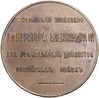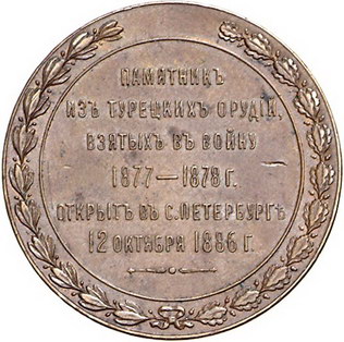 Los-Nummer: Auktion 51 - 3850 Ausländische Münzen und Medaillen Russland Alexander III. 1881-1894, Bronzemedaille 1886, von unsigniert. Auf die Einweihung des Denkmals zur Erinnerung an die Kriege gegen die Türken, welches aus den erbeuteten Kanonen errichtet wurde. Beiderseits Schrift. Diakov 974.2, Smirnov 922. 33 mm. Vorzüglich Schätzpreis: 90,- Zuschlag: unverkauft |